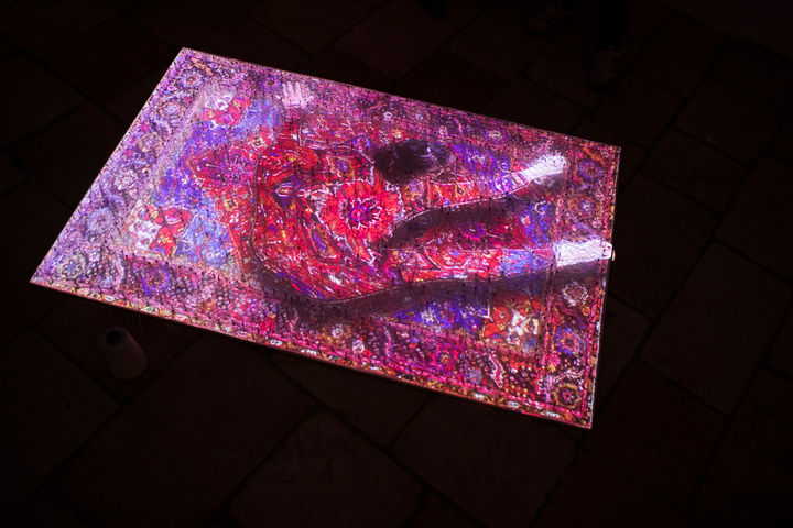 Adi Yair, a fashion designer who weaves her textiles by hand using a traditional loom, and Shlomit “Mejadra eyes”, a video artist who breathes life into still object and materials by means of precise video mapping projections. have joined forces to create a carpet floor display that lies between the real and the imagined. The installation offers a demarcation of boundaries between East and West by mixing technique, representation, and outline.